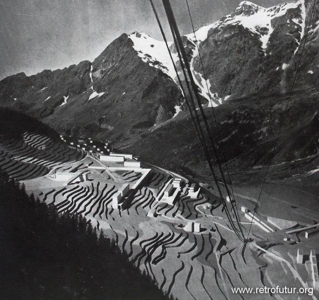 Il piano prevedeva una serie di alberghi e ristoranti sull'altipiano di Cielo Alto, strettamente allineati in modo parallelo. Una funicolare (riconoscibile come trincea diagonale nel centro dell'immagine) avrebbe collegato la stazione delle autocorriere in fondovalle con i piani alti.