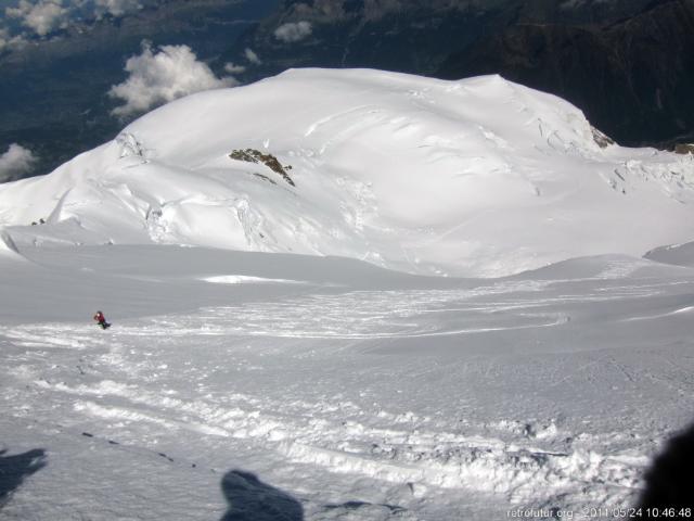 10:46 - Der Hang wartet. Und Klaus. Ein gutes Stück weiter unten der Dôme du Goûter mit seinen bescheidener Höhe von lediglich 4303 m.