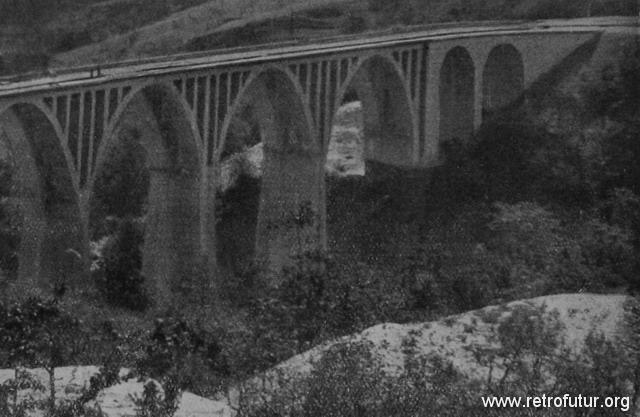 Si noti, di contro lo sfondo verde scuro della vegetazione, la leggera struttura a due volte gemelle, collegata da una soletta che porta il piano stradale. Le volte hanno la larghezza di m. 3; la soletta di m. 9. La largezza netta fra i parapetti e di m. 11,20.