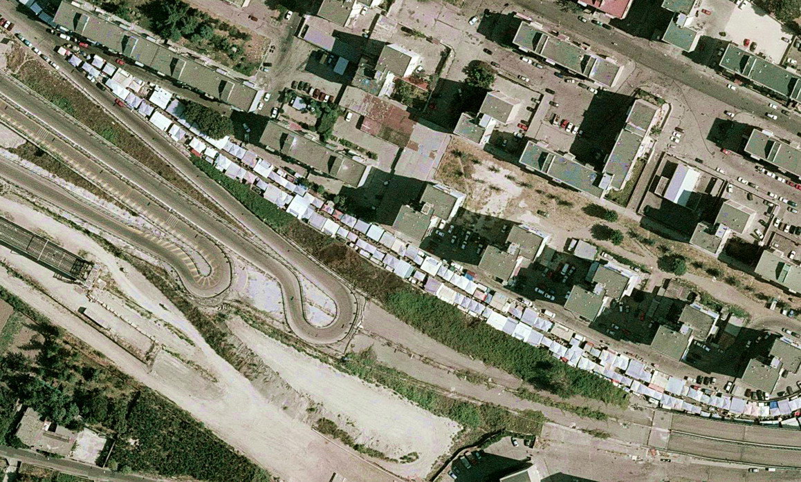 Ehemals Anfang und Ende der Schnellstrasse. Der Verkehr wurde durch zwei Haarnadelkurven von der eigentlichen Chaussé zwangsweise über die Abfahrtsrampen umgeleitet. Diese Haarnadelkurve und der gerade Streckenabschnitt davor lassen Formel 1- ähnliche Rennenveranstaltungen erahnen. Nördlich der Schnellstrasse scheint im Moment der Bildaufnahme ein Markt stattgefunden zu haben. Das Leben scheint den Umgang mit dem Irrealen gewohnt zu sein.