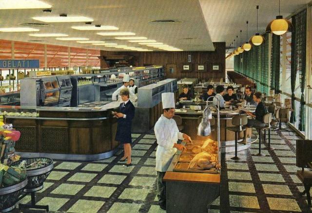 Self Servce Inseln. Kein Grill, aber Grillhändel, Autogrill. Elegant gekleidet, mit Kochhaube. Hier wird effizient zubereitet für den modernen Gast.