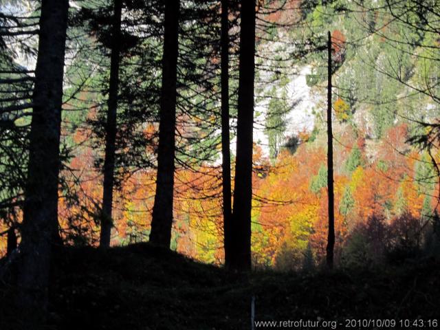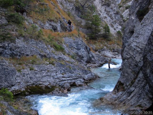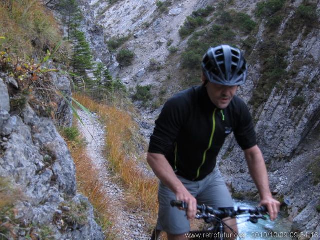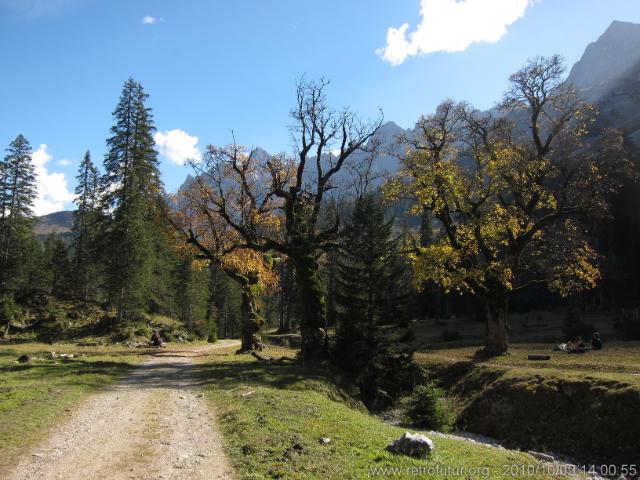 8.10.2010: Abends den Zug nach Hochzirl, 16:30. Per MTB rauf zum Solsteinhaus. Ein Schnitzel, einen Kaiserschmarn und eine Nacht später hinunter durch das Kristental plus Gleirschtalklamm. Über den Karwendelsteig ins Karwendeltal mit Spaghettipause im Karwendelhaus. Über den Wanderweg hinab zum kleinen Ahornboden. Doppelter Snakebite. Nach Hinterriß linksseitig auf ehem. Wegestrassé. Durch die Abendsonne in den endlosen Isarauen. Nebelattacke vor Krün. Mittenwald. Scharnitz 19:30. Zug Retour.