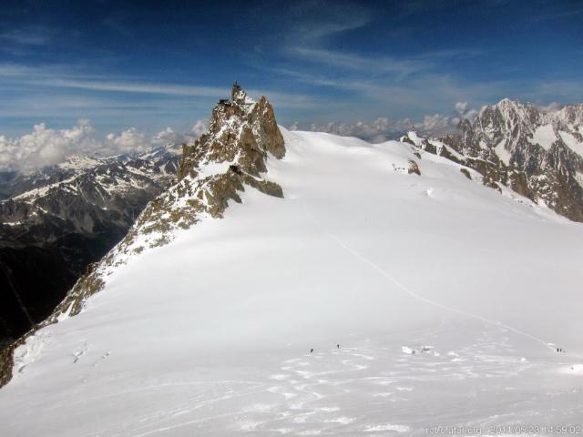14:49 - Einfach laufen lassen. Zöpfe flechten hinab zum Col du Midi (3532m). In den Himmel ragt die Bergstation der Aiguille Du Midi mit Seilbahn (3842 m), darunter über dem Gletscherplateau unsere Herberge für die Nacht, das Refuge des Cosmiques (3613m)