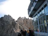 Mutige Bergsteiger steigen von der Seilbahnterasse (links) auf den Zugspitzgipfel auf (rechts)