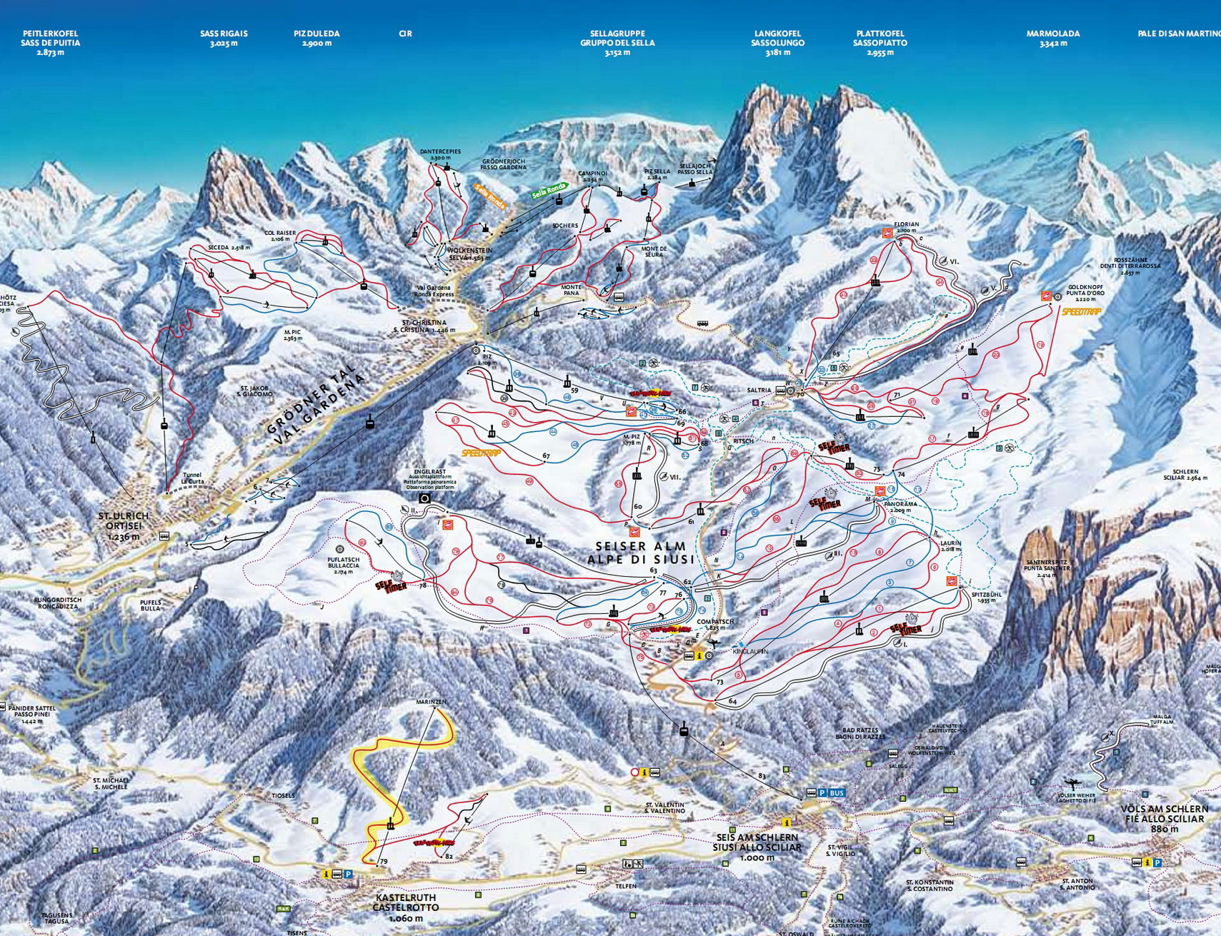 Kastelruth unten links mit dem den Korblift ersetzenden Sessellift Marinzen.