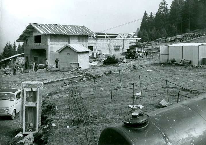 Luglio 1969: Prà Rotond in costruzione. A sinistra l'arrivo della cestovia, a destra la partenza della seggiovia monoposto